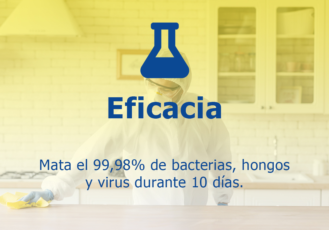 Bacoban es el único con una acción biocida constante de 10 días después de la aplicación, totalmente certificado y probado. Aumenta mucho el control de infecciones. La microcapa antimicrobiana que forma también reduce la limpieza de rutina y sus costos en más de un 50% comprobado.